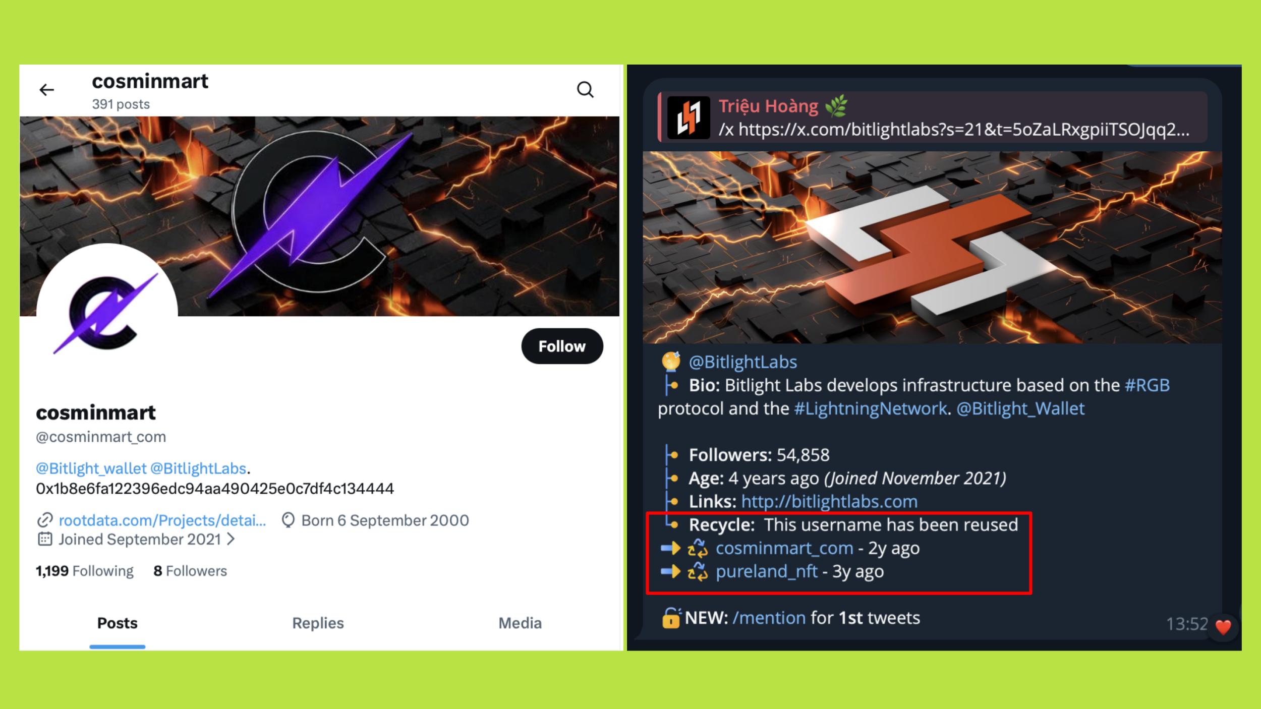 Một chi tiết khác được phát hiện sau cú sập của LIGHT liên quan đến kênh truyền thông chính thức của dự án. Tài khoản X đại diện cho Bitlight Labs (@BitlightLabs) cho thấy dấu hiệu username từng được tái sử dụng. Dữ liệu công khai cho thấy tài khoản này đã tồn tại khoảng 4 năm, nhưng trước khi mang tên Bitlight Labs, nó từng sử dụng các username khác như cosminmart_com và pureland_nft.
