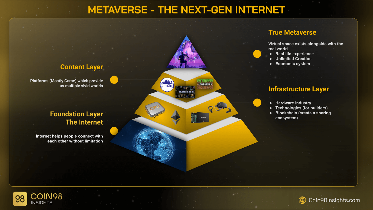 - Ở lớp Content, chúng ta có thể thấy những hình thái đầu tiên của Metaverse dưới dạng các tựa game, và Layer này vẫn đang chờ đợi sự hoàn thiện hơn nữa từ Infrastructure để có thể thật sự bùng nổ trong tương lai.