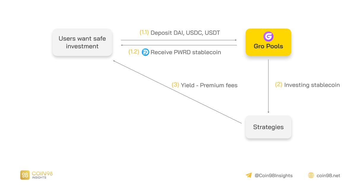 (1) Anh em deposit DAI, USDC, USDT vào Gro Protocol pool và nhận về PWRD stablecoin với tỉ lệ 1:1. Về cơ bản, PWRD được bảo đảm bởi stablecoin nên luôn có giá $1.