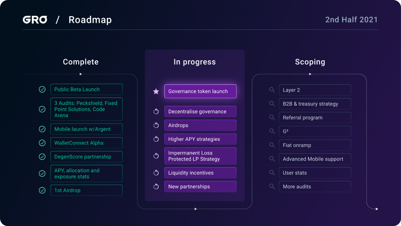 Không có quá nhiều thông tin về định hướng tương lai của Gro Protocol, dưới đây là roadmap trong H2/2021 của dự án.
