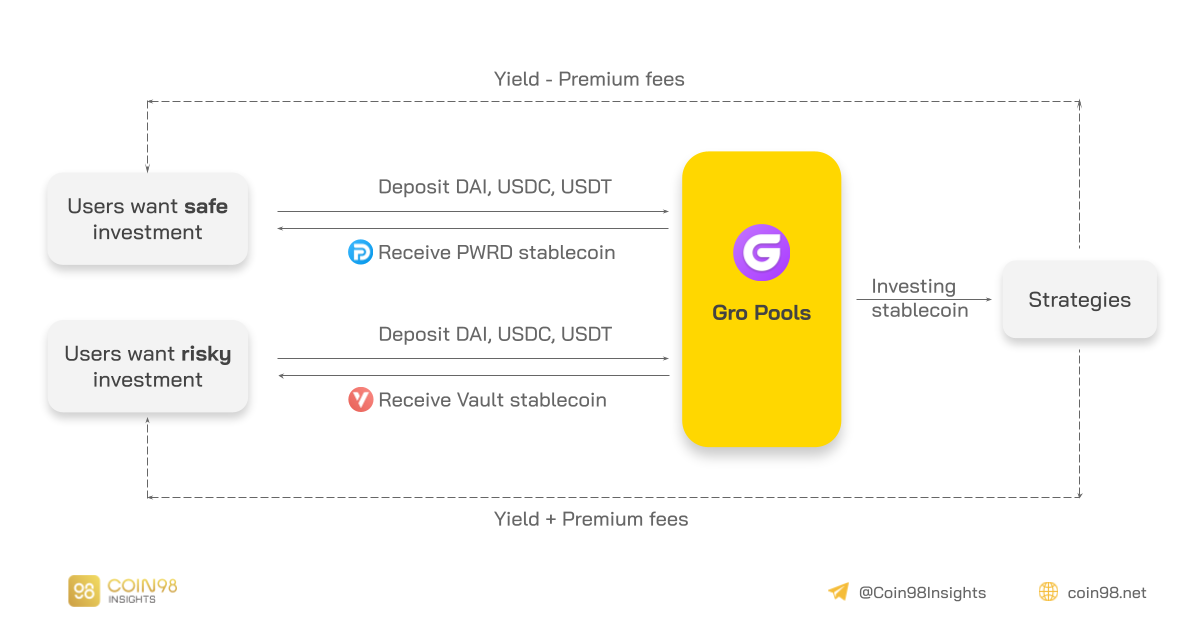 Do đó có thể thấy, stablecoin dù đang là một nguồn yield tốt nhưng vẫn đi kèm 1 số rủi ro nhất định, đó là lí do Gro Protocol ra đời, phân chia lại rủi ro và lợi nhuận khi đầu tư stablecoin, giúp người dùng đầu tư stablecoin an toàn hơn hoặc cũng có thể kiếm yield cao hơn.