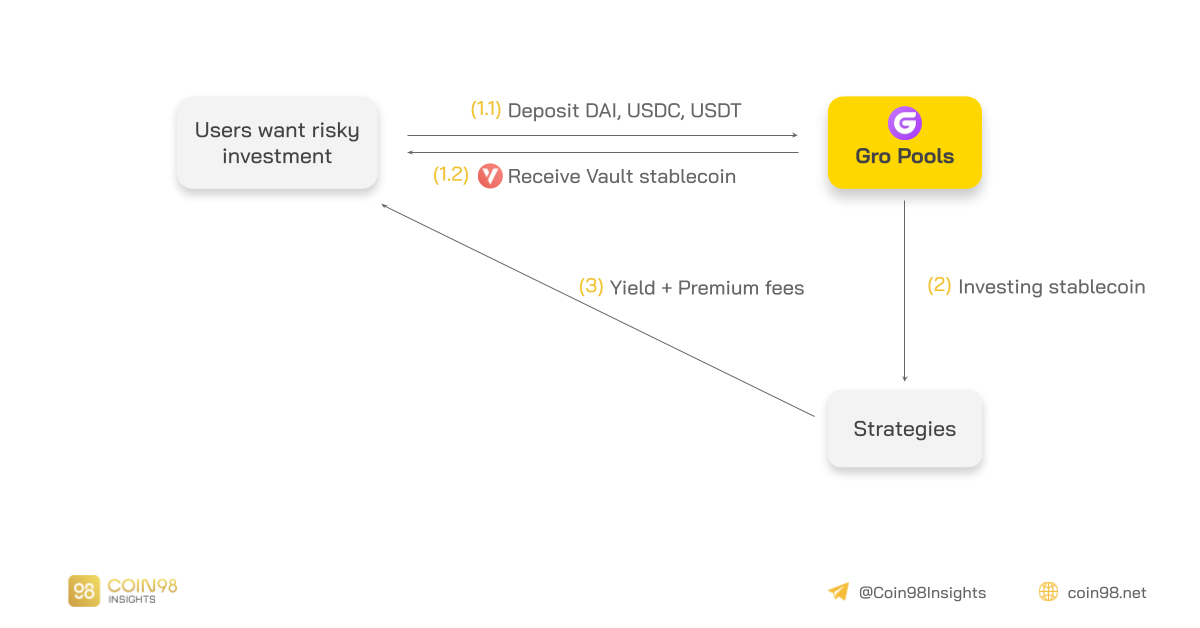 (1) Anh em deposit DAI, USDC, USDT vào Gro Protocol pool và nhận về Vault Stablecoin với tỉ lệ 1:1. Về cơ bản, Vault cũng được bảo đảm bởi stablecoin nên luôn có giá $1.