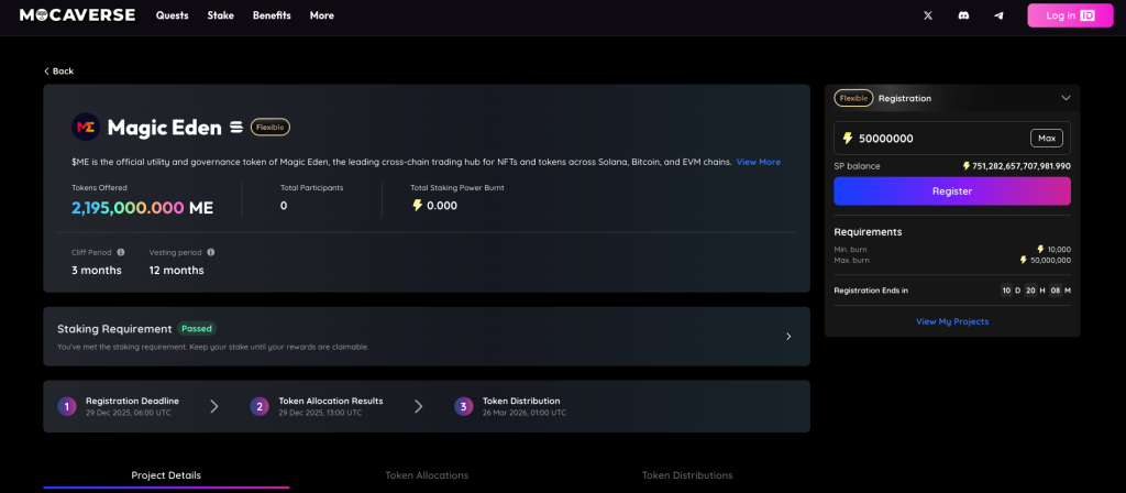 Để tham gia, người dùng cần kết nối ví đang nắm giữ Staking Power với nền tảng Mocaverse, sau đó mua và stake MOCA để tích lũy SP. Khi đạt ngưỡng tối thiểu, người dùng truy cập mục MocaPortfolio, lựa chọn dự án Magic Eden (ME), nhập lượng Staking Power muốn burn và xác nhận giao dịch để hoàn tất đăng ký.