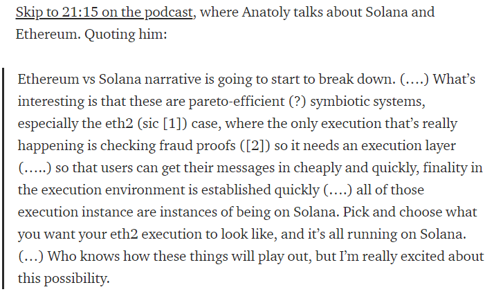 - Lúc này các Monolithic blockchain như Solana, Polygon, BSC có thể trở thành một layer 2 RollUps trên Ethereum. Nguyên nhân đơn giản là các blockchain này vẫn sẽ giữ được điểm mạnh của mạng lưới của mình và để việc bảo mật cho layer 1 Ethereum lo. Anatoly, founder của Solana cũng chia sẻ về tầm nhìn về một tương lai khi Solana có một layer 1 (execution environment) lo phần bảo mật để Solana có thể tối ưu những điểm mạnh sẵn có của mình.