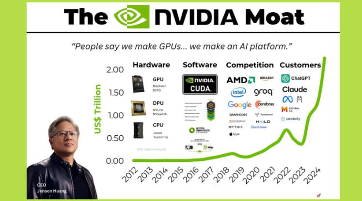 Khi Big Data, Deep Learning bùng nổ vào đầu những năm 2010, các nhà nghiên cứu phát hiện ra rằng mạng neural huấn luyện trên GPU nhanh hơn CPU hàng chục lần. Mọi phòng thí nghiệm AI đều cần CUDA. Mỗi mô hình mới cần hàng nghìn, rồi hàng chục nghìn GPU để huấn luyện. Các nhà nghiên cứu đã ở sẵn trong hệ sinh thái của họ. Các công ty AI như OpenAI, Google, Meta, Tesla đều xây hạ tầng trên GPU NVIDIA vì mọi công cụ huấn luyện tốt nhất đều tối ưu cho CUDA.