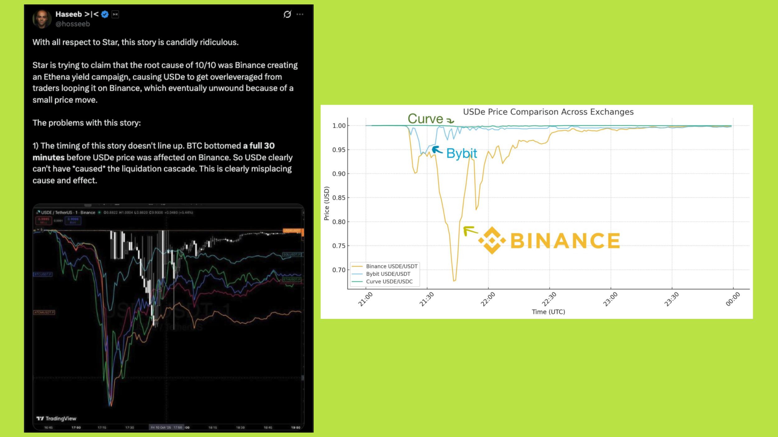 Ở phía còn lại, những người phản biện như Haseeb Qureshi của Dragonfly và CZ của Binance cho rằng việc quy toàn bộ cú sập cho USDe là cách nhìn quá đơn giản. Họ chỉ ra rằng Bitcoin đã bắt đầu giảm trước khi USDe có dấu hiệu mất peg là khi một đồng stablecoin (hoặc tài sản “neo giá”) không còn giữ được mức giá mục tiêu mà nó cam kết.