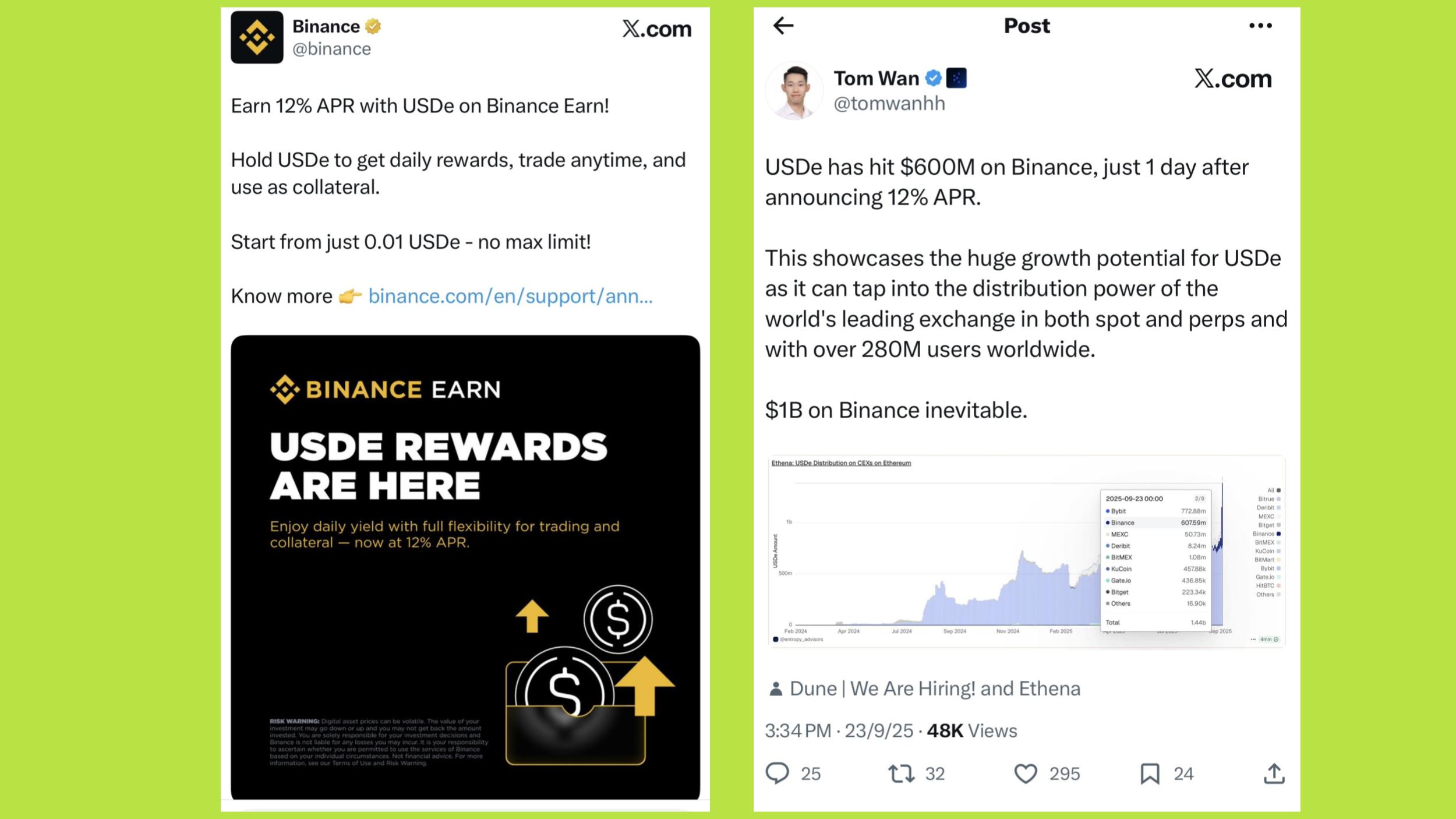 Ở một phía, CEO OKX Star Xu khẳng định đây không phải tai nạn và cũng không phải sự trùng hợp. Theo ông, cú sập là hệ quả trực tiếp của các chiến dịch thu hút người dùng bằng lợi suất cao nhưng thiếu minh bạch về rủi ro. Trọng tâm trong lập luận của ông là USDe, token sinh lợi của Ethena, cùng cách nó được tích hợp và quảng bá trên Binance như một tài sản “ổn định” có thể sử dụng tương tự USDT hay USDC.