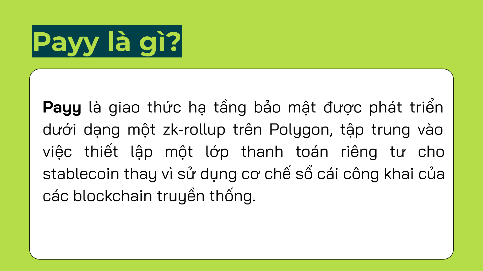 Payy là giao thức hạ tầng bảo mật được phát triển dưới dạng zk-rollup trên Polygon, tập trung vào việc thiết lập một lớp thanh toán riêng tư cho stablecoin thay vì sử dụng cơ chế sổ cái công khai của các blockchain truyền thống.