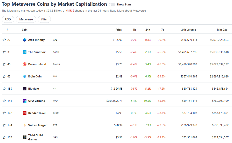 Gần như tất cả top dự án Metaverse có vốn hóa cao nhất đều được list trên Binance - Nguồn: Coingecko