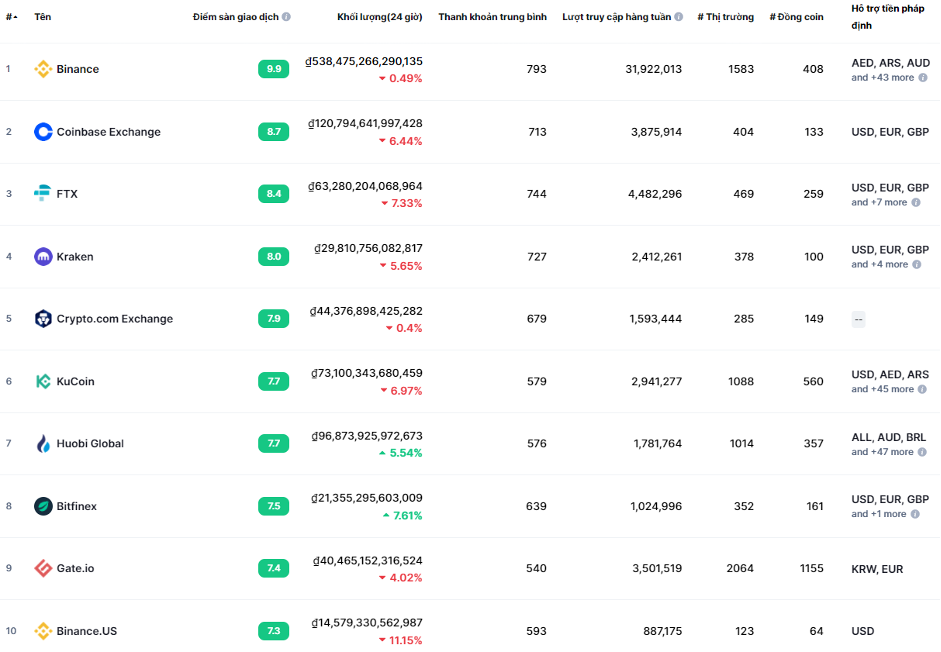 Top 10 sàn có số điểm giao dịch lớn nhất được đánh giá theo nhiều tiêu chí - Nguồn: Coinmarketcap