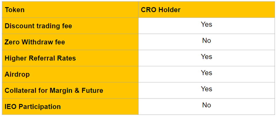 CRO token (CRO) là Utility token cung cấp một số lợi ích nhất định cho Holders. Trong phạm vi của sàn giao dịch Crypto.com, CRO có một số trường hợp sử dụng nổi bật sau: