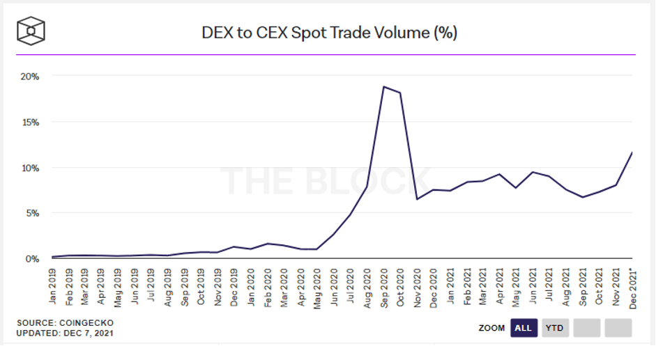 Thị phần của DEX đang ăn dần thị phần của CEX - Nguồn: The block