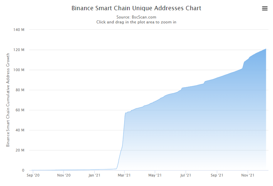 Trong số các CEX có chain riêng thì Binance Smart Chain cũng là chain có lượng người dùng, số tài sản khóa cao nhất. Hiện TVL của BSC đạt 17 tỷ đô và số lượng địa chỉ được tạo mới có tốc độ tăng trưởng đều đặn.
