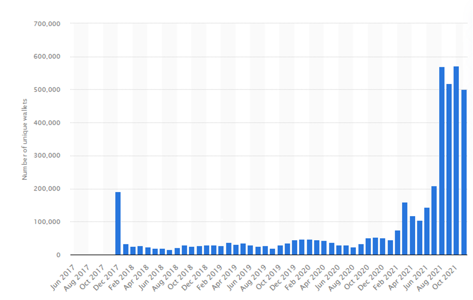 Số lượng địa chỉ ví từng mua hoặc bán NFT từ năm 2017 đến nay - Nguồn: Satista