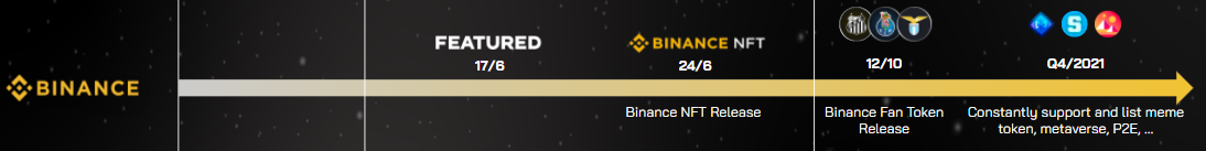 - Ngày 24/06, ra mắt Binance NFT Marketplace: Đây là marketplace cho NFTs của các dự án Gaming và các NFTs khác của người dùng. Ngoài ra Binance NFT marketplace còn hỗ trợ IGO, launchpad dành riêng cho các dự án mảng GameFi.