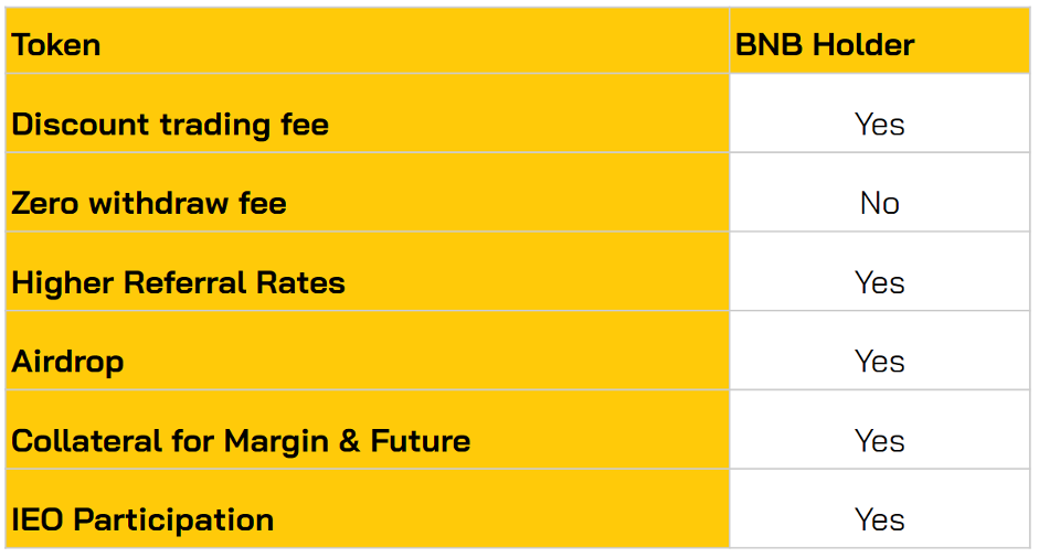 Binance token (BNB) là Utility token cung cấp một số lợi ích nhất định cho Holders. Trong phạm vi của sàn giao dịch Binance, BNB có một số trường hợp sử dụng nổi bật sau: