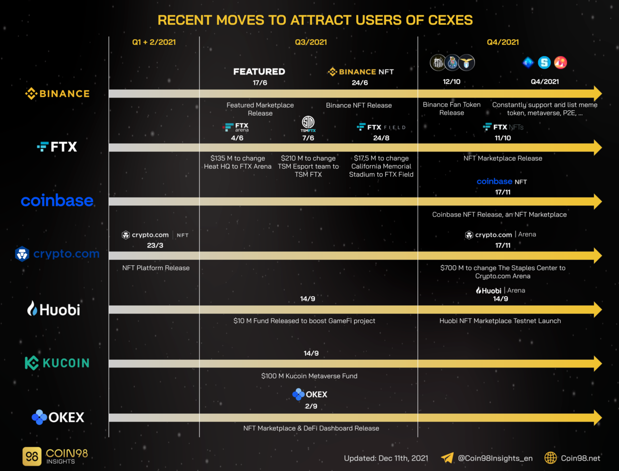 Vậy nếu biện pháp thu hút người dùng cũ khó thực hiện thì tại sao không chuyển hướng sang thu hút người dùng và dòng tiền mới? Đó chính là điều mà Coin98 Insights thấy được trong những nước đi của các CEX hiện nay. Và ở dưới ta sẽ cùng phân tích các nước đi đó để xem ai là kẻ đang dẫn đầu cuộc đua.