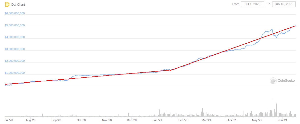 Tổng kết lại, kể từ lúc bắt đầu ra mắt từ cuối năm 2017, dự án mất hơn 2,5 năm, đến 6/2020 để đạt được vốn hóa $100 M, nhưng chỉ cần sau 1 năm, DAI đã tăng trên mức $5 B vốn hóa, một tốc độ tăng rất nhanh, và đang tiếp tục tăng tuyến tính.