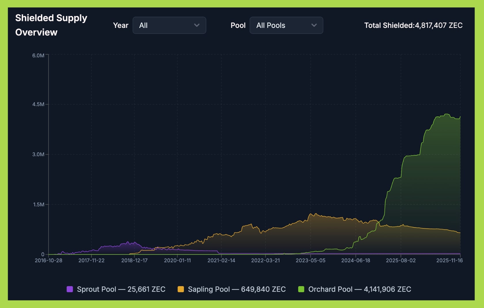 Và thị trường lập tức phản hồi: khối lượng ZEC trên Intents vượt cả BTC nhiều tuần liền; gần một triệu ZEC được đưa vào các pool shielded chỉ trong tháng 10; Orchard tiến sát mốc 5 triệu ZEC - lớn nhất lịch sử. Đây là bằng chứng hiếm hoi trong thị trường crypto rằng narrative không chỉ sống bằng lời nói, mà bằng hành vi dòng vốn.