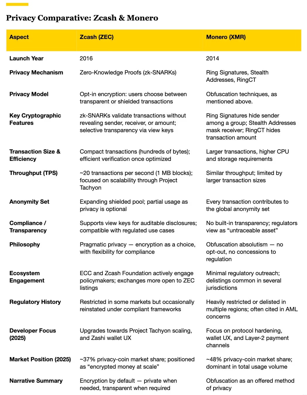 Cú tăng giá của ZEC không thể tách khỏi loạt cuộc tranh luận về “chuẩn riêng tư” trong crypto. Trong nhiều năm, Monero là đại diện mặc định cho privacy coins; Bitcoin được xem là “minh bạch theo thiết kế”; còn Zcash đứng giữa và phần lớn bị bỏ qua.