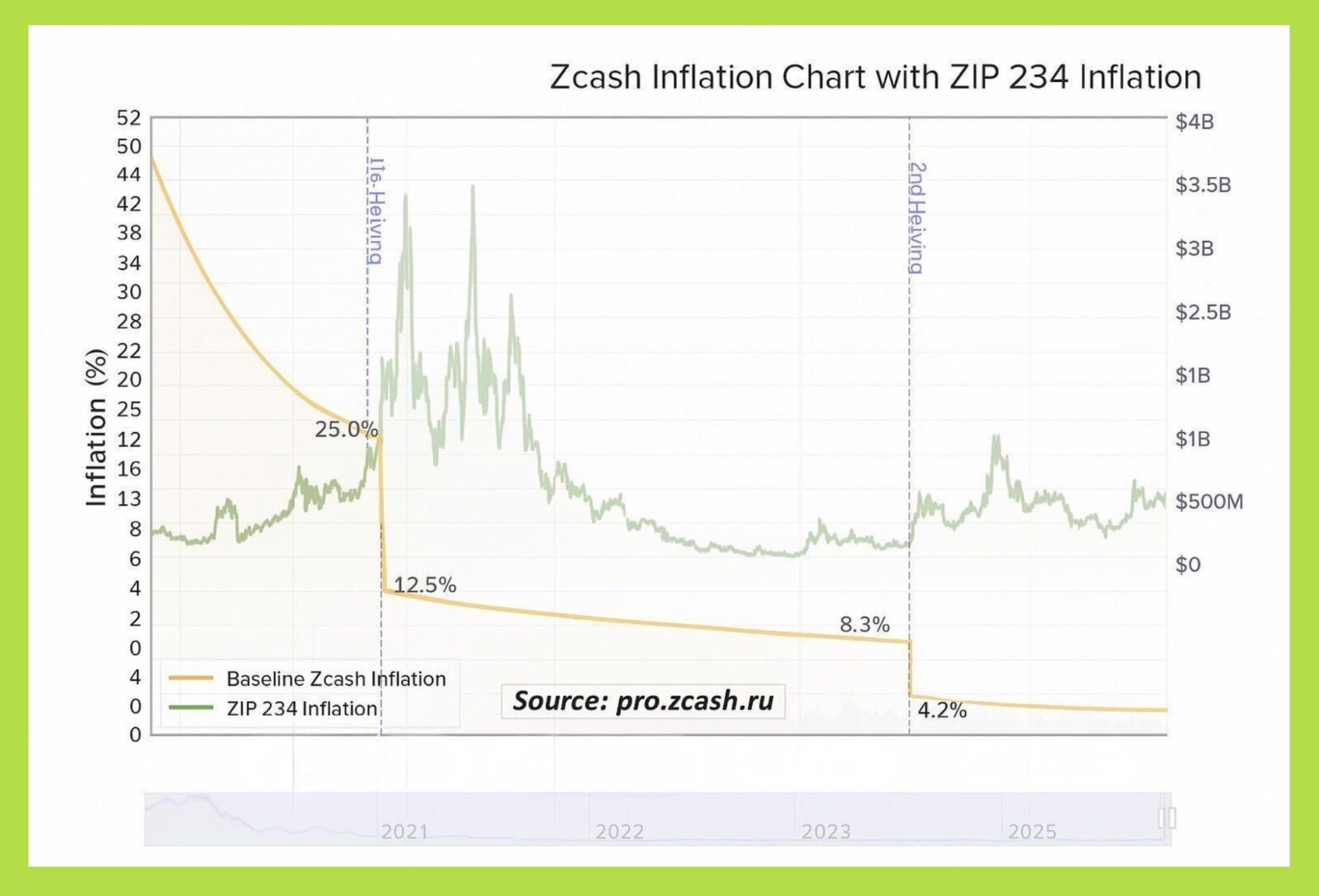 Đến cuối 2025, ZEC đã phát hành khoảng 17–18 triệu coin (khoảng 80% tổng cung), và khi chạm ngưỡng 21 triệu vào năm 2140, lạm phát sẽ hoàn toàn bằng 0. Cơ chế halving diễn ra mỗi 4 năm: từ halving 2020 (giảm reward từ 12,5 xuống 6,25 ZEC), halving 2024 (giảm xuống 3,125 ZEC), và dự kiến halving 2028 sẽ giảm tiếp còn 1,5625 ZEC.