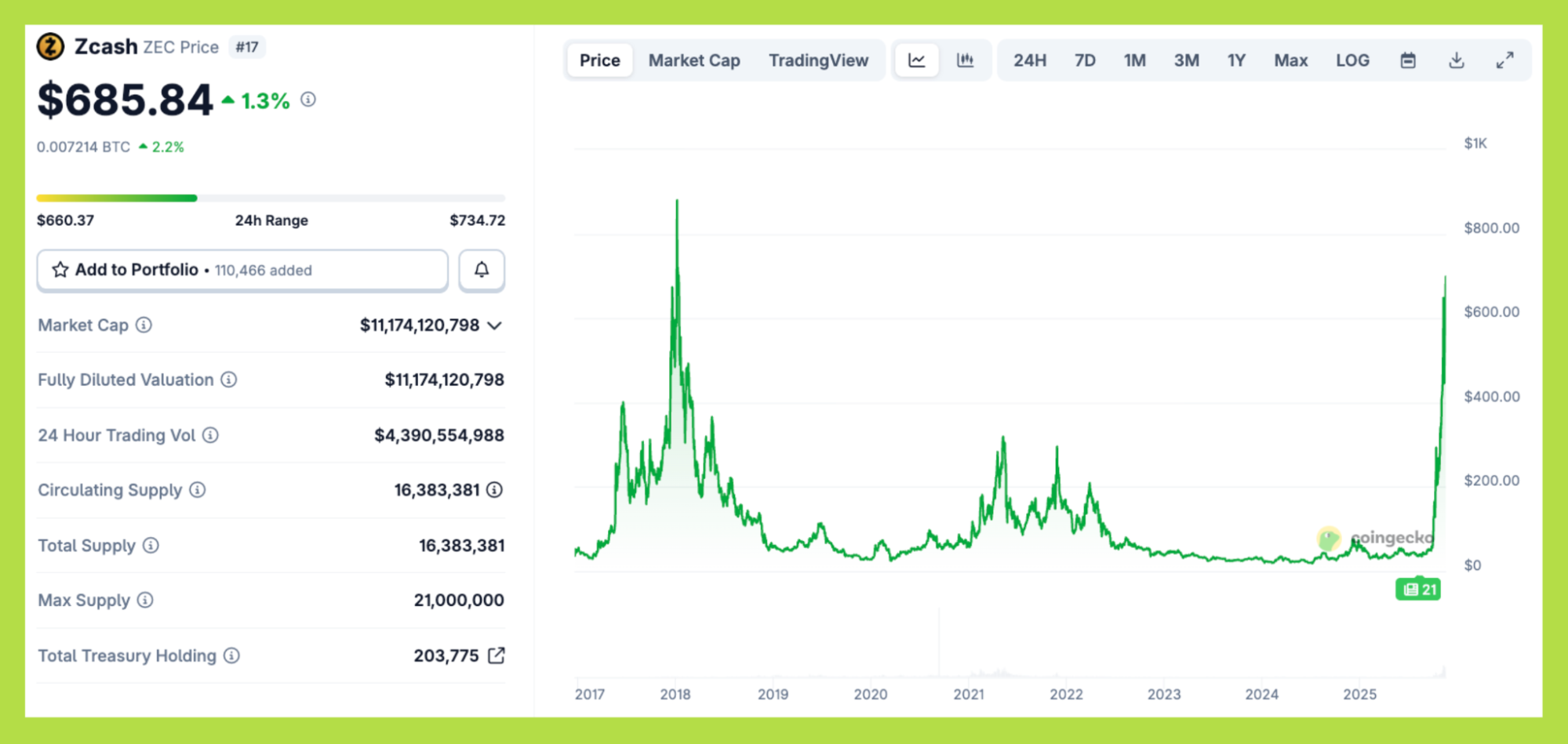 Thế nhưng điều bất ngờ xảy ra: từ đáy ~16 USD cuối 2024, ZEC tăng thẳng lên hơn 700 USD chỉ trong vài tháng, tức 40 lần, trong lúc toàn thị trường gần như bất động. Cú tăng này không chỉ là biến động giá; nó kéo cả narrative “quyền riêng tư” trở lại trung tâm, khiến những cái tên có ảnh hưởng như Naval Ravikant, Mert (Helius), Winklevoss hay các nhà nghiên cứu Delphi, Messari đồng loạt nói về Zcash.