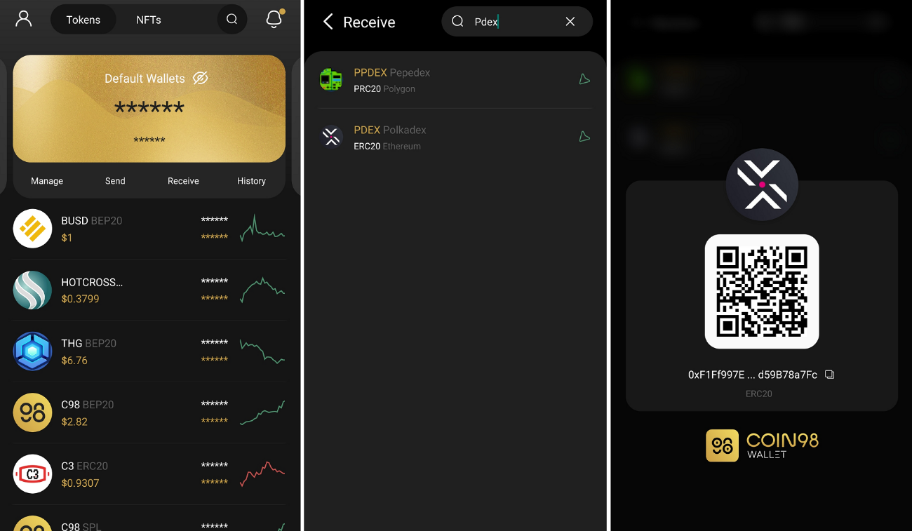 PDEX là token ERC-20 nên các bạn có thể lưu trữ nó trên Coin98 Wallet với các thao tác đơn giản sau: