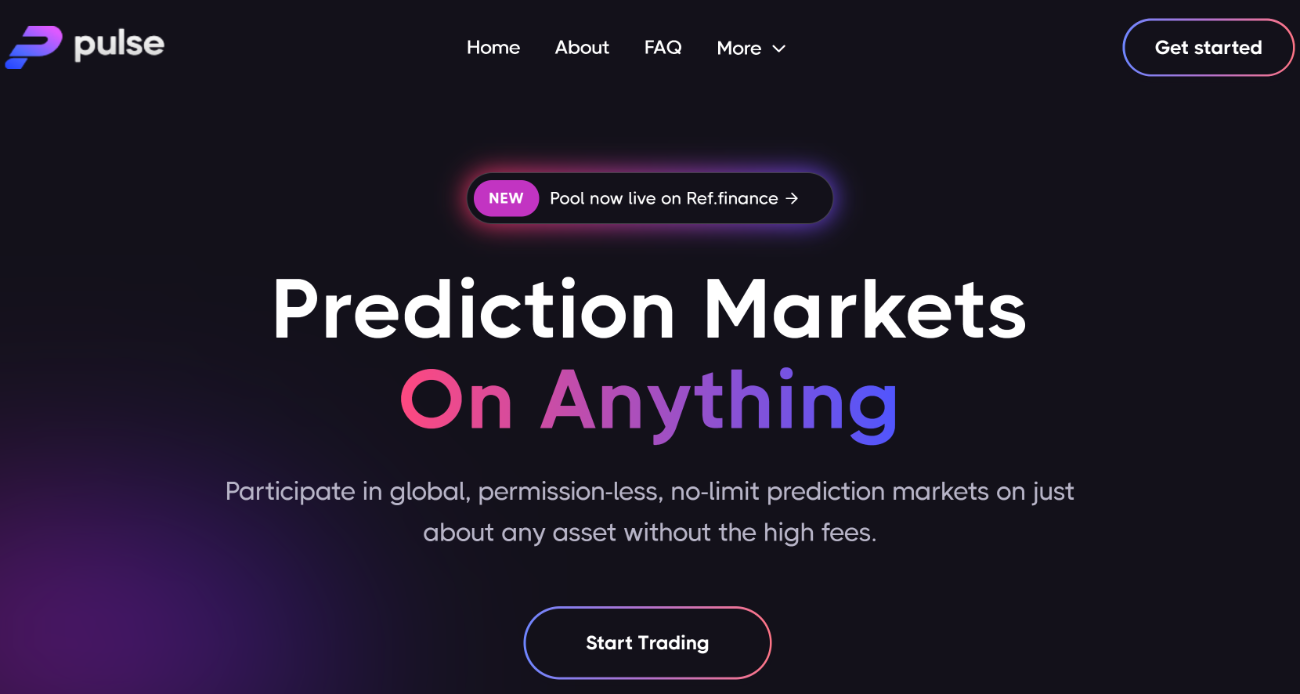 Pulse market là nền tảng thị trường dự đoán (prediction market) phi tập trung được xây dựng trên chuỗi khối NEAR. Pulse muốn xây dựng một nền tảng prediction đơn giản dễ tiếp cận đến mọi thành phần, ưu thế chi phí giao dịch rẻ của mạng NEAR và có được sự minh bạch, rõ ràng chống lại sự thao túng của các tổ chức khác.