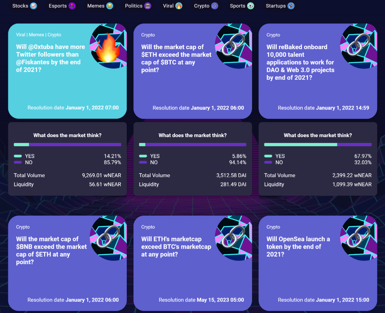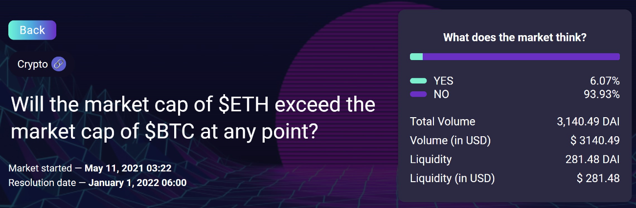 Ví dụ: ở hình dưới là câu hỏi “Vốn hóa của đồng ETH có vượt được vốn hóa của đồng BTC tại bất kỳ thời điểm nào không? “YES”, “NO” Resolution day: Ngày 1 tháng 1 năm 2022.
