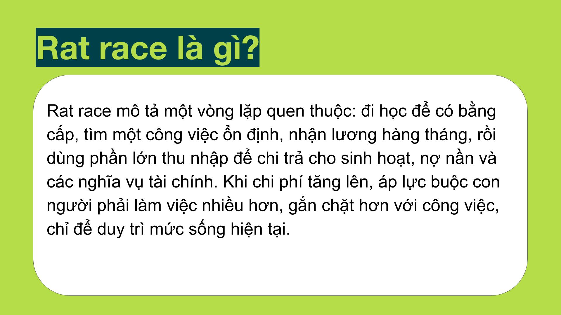 “Rat race” (cuộc đua chuột) là cách mô tả một vòng lặp phổ biến trong đời sống hiện đại, nơi con người liên tục làm việc để duy trì thu nhập và mức sống, nhưng cảm giác tự do và an toàn tài chính lại không theo kịp. Thu nhập có thể tăng, nhưng cùng lúc đó là chi phí sinh hoạt, nghĩa vụ tài chính và áp lực xã hội ngày càng lớn, khiến nỗ lực cá nhân khó chuyển hóa thành sự ổn định dài hạn.