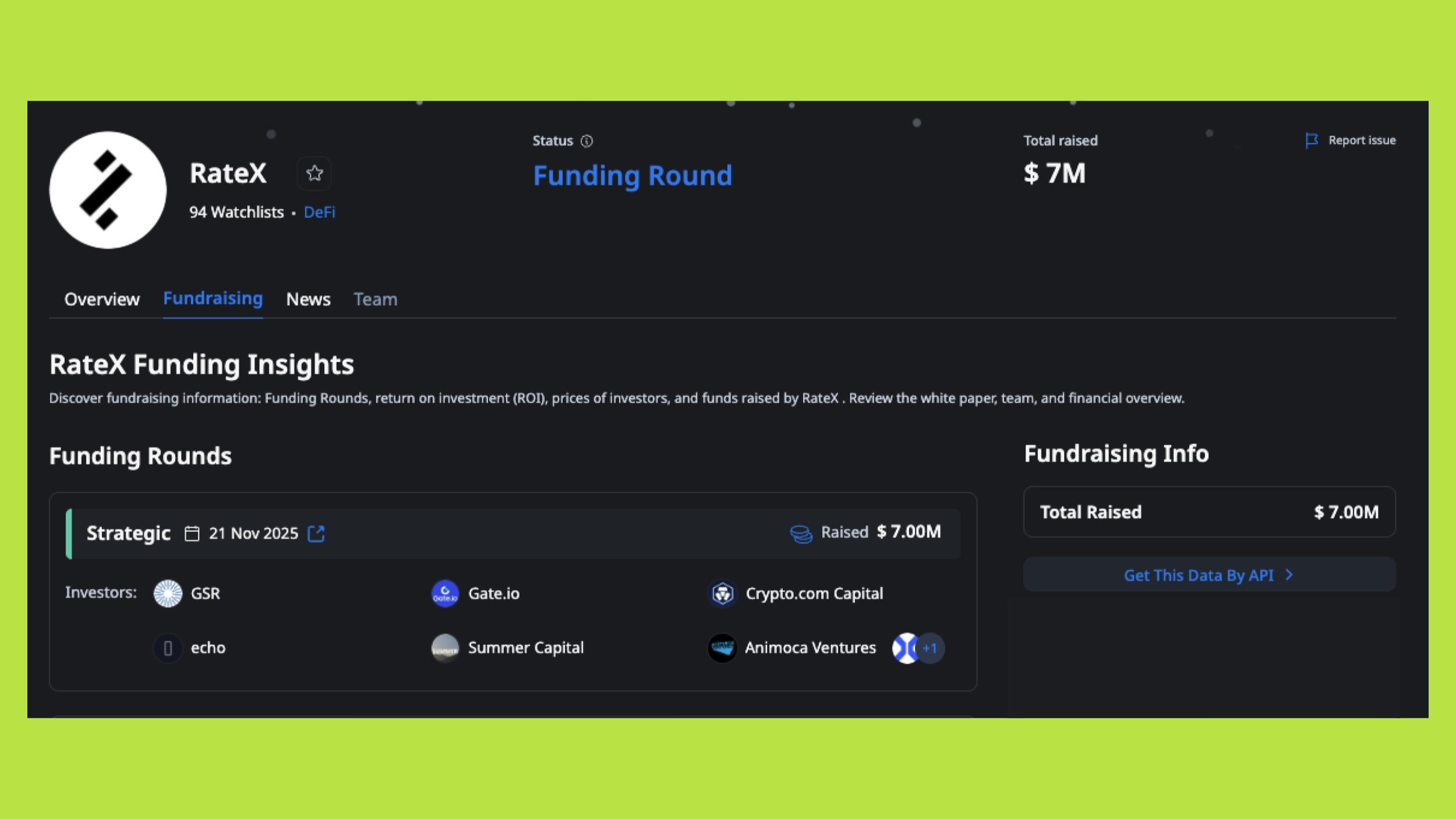 RateX đã hoàn tất vòng gọi vốn trị giá 7 triệu USD, với sự tham gia của một số quỹ đầu tư và tổ chức hoạt động lâu năm trong lĩnh vực crypto và hạ tầng tài chính số, nổi bật có Animoca Ventures, GSR, Echo, Crypto.com Capital và Gate Ventures.