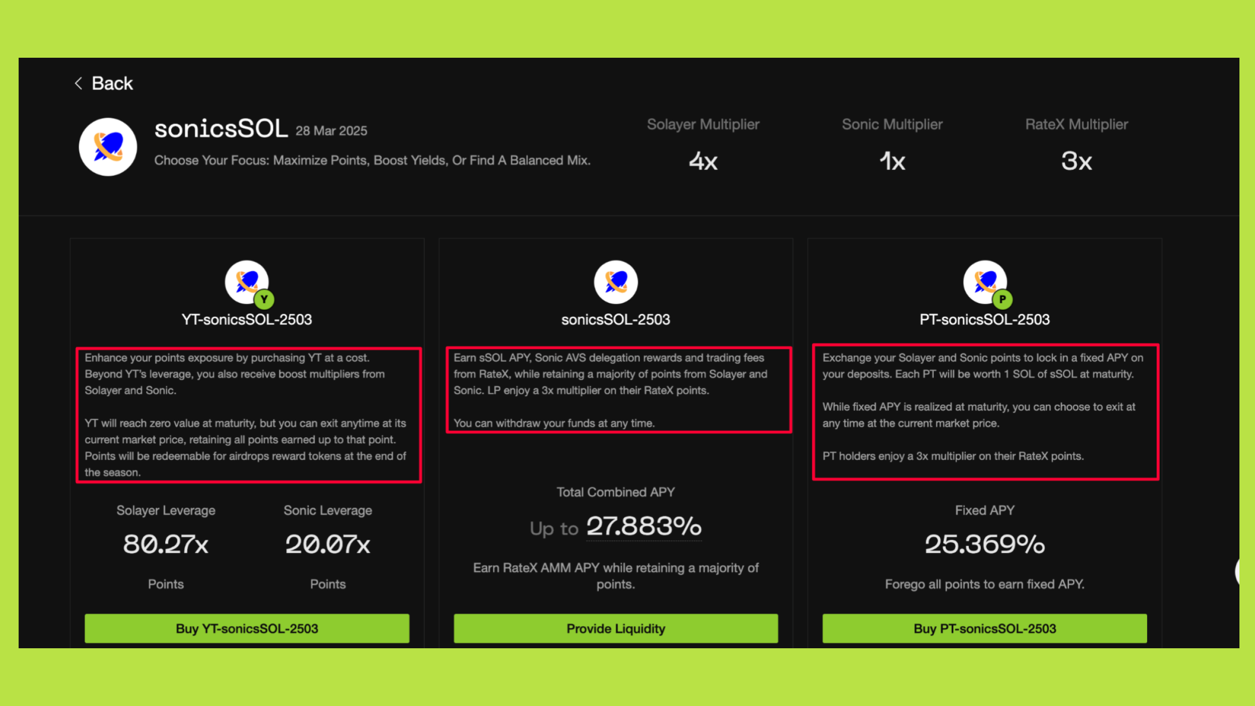 RateX triển khai chương trình Points Pre-Acceleration nhằm khuyến khích người dùng sớm tham gia giao thức thông qua các hoạt động giao dịch yield và cung cấp thanh khoản. Người dùng có thể tích lũy RateX Points, đồng thời nhận thêm points từ các dự án đối tác như Solayer và Sonic, tùy theo loại tài sản và chiến lược tham gia.