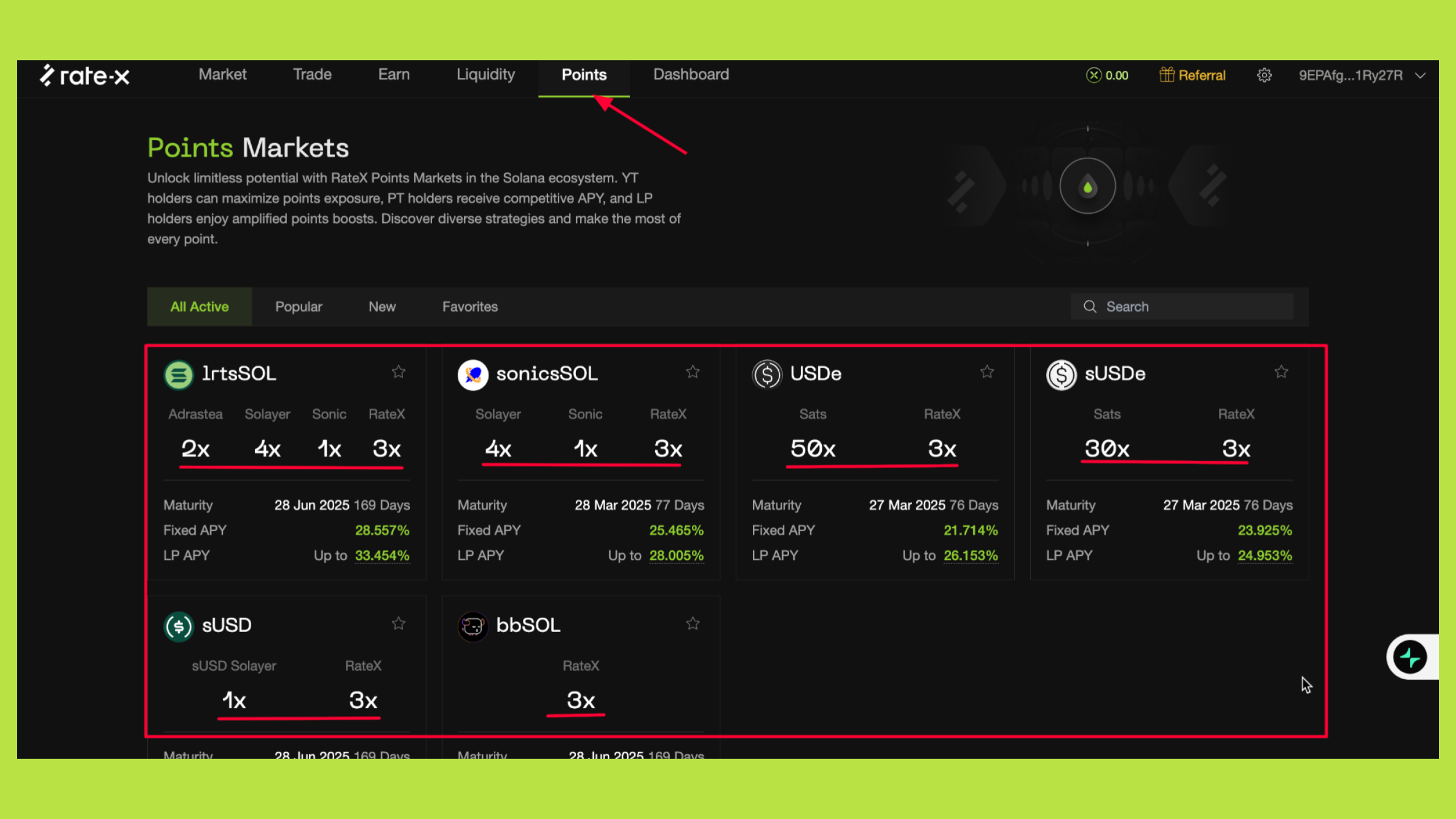 Sau khi kết nối ví, vào tab Points để xem danh sách các tài sản và sản phẩm đang được áp dụng chương trình tích điểm. Tại đây, RateX hiển thị rõ loại tài sản, hệ số boost và nguồn points có thể nhận được (RateX, Solayer, Sonic).