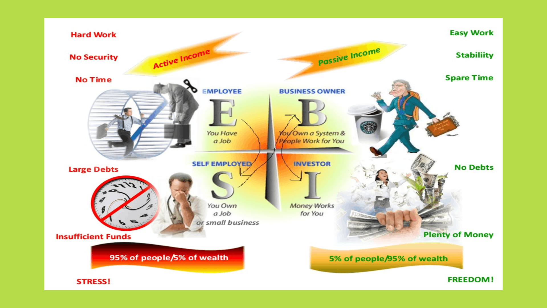 - I (Investor - Nhà đầu tư): Những người bắt tiền làm việc cho mình (Sử dụng tiền để tạo ra thêm nhiều tiền hơn).