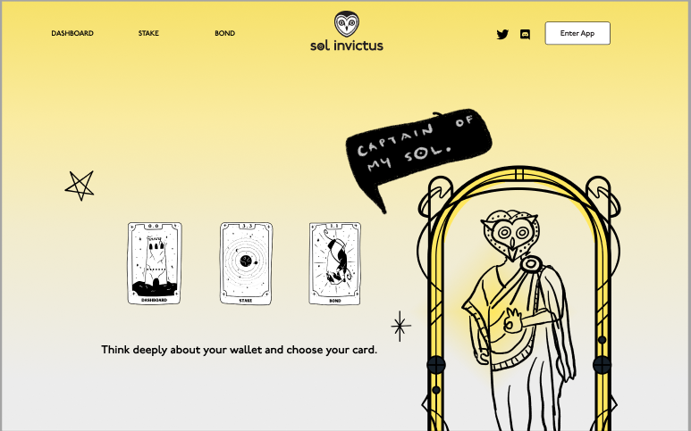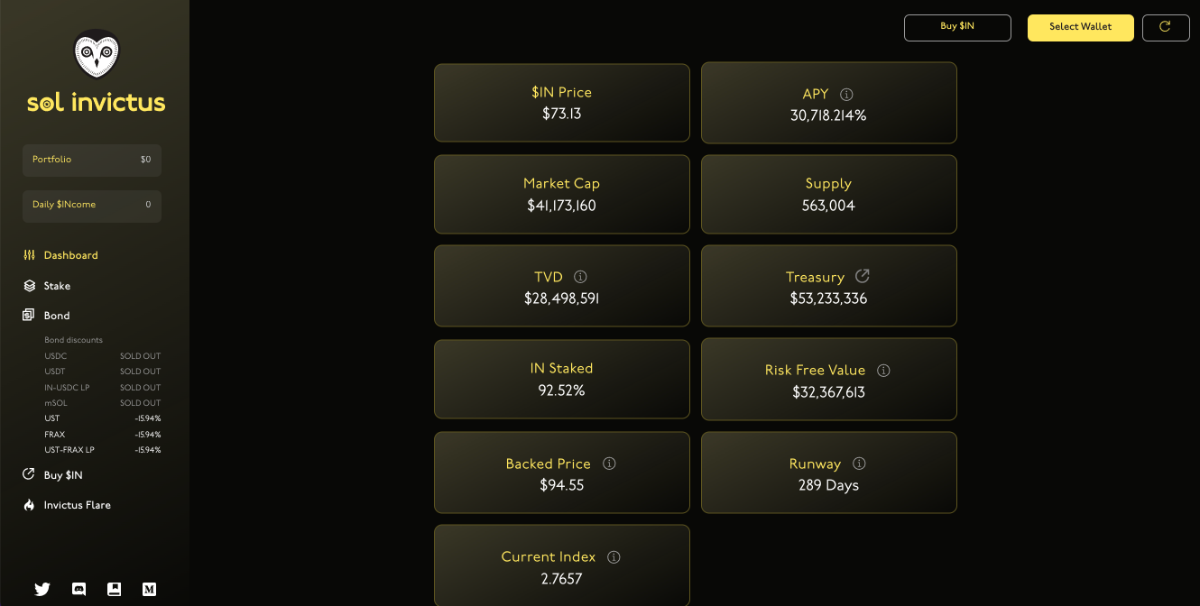Sol Invictus là giao thức tiền tệ phi tập trung được xây dựng trên hệ sinh thái Solana. Lấy cảm hứng từ OlympusDAO, mỗi token IN được hỗ trợ bởi nhóm tài sản khác như USDC, USDT, mSOL và USDC LP trong Invictus Treasury (Kho bạc Invictus).