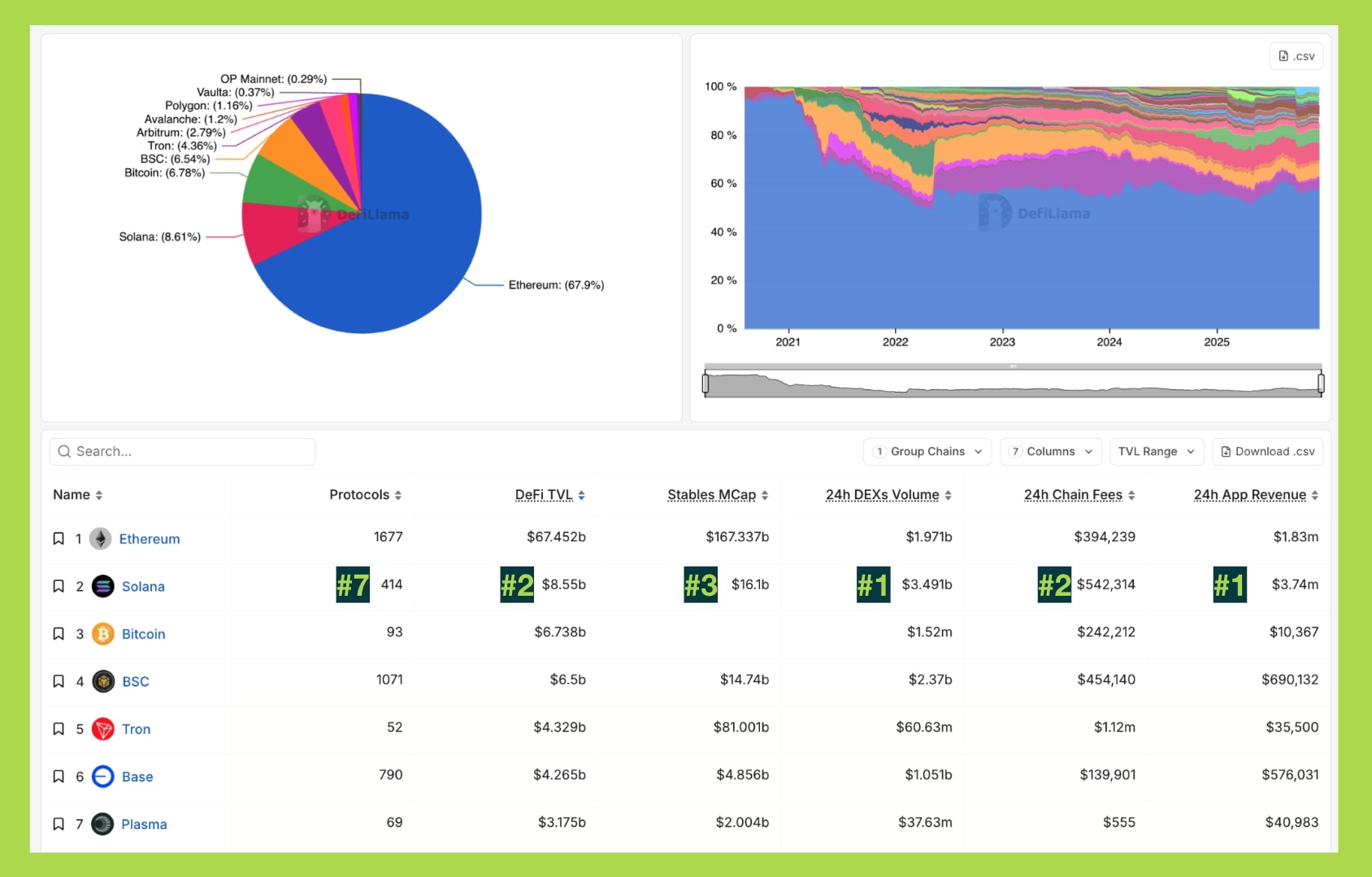 Thị trường đã có một ví dụ rất rõ là Tron. Dù không nổi bật về DeFi hay công nghệ, Tron vẫn là nơi Tether phát hành hơn 80 tỷ USD USDT, chỉ đứng sau Ethereum với khoảng 100 tỷ USD. Con số này không đến từ narrative hay incentive, mà từ nhu cầu sử dụng thực tế: chuyển stablecoin nhanh, rẻ và đơn giản. Vai trò “đường ống thanh toán” này giúp Tron duy trì settlement volume lớn và ổn định xuyên suốt 2024–2025, kéo theo phí mạng và nhu cầu blockspace đều đặn.