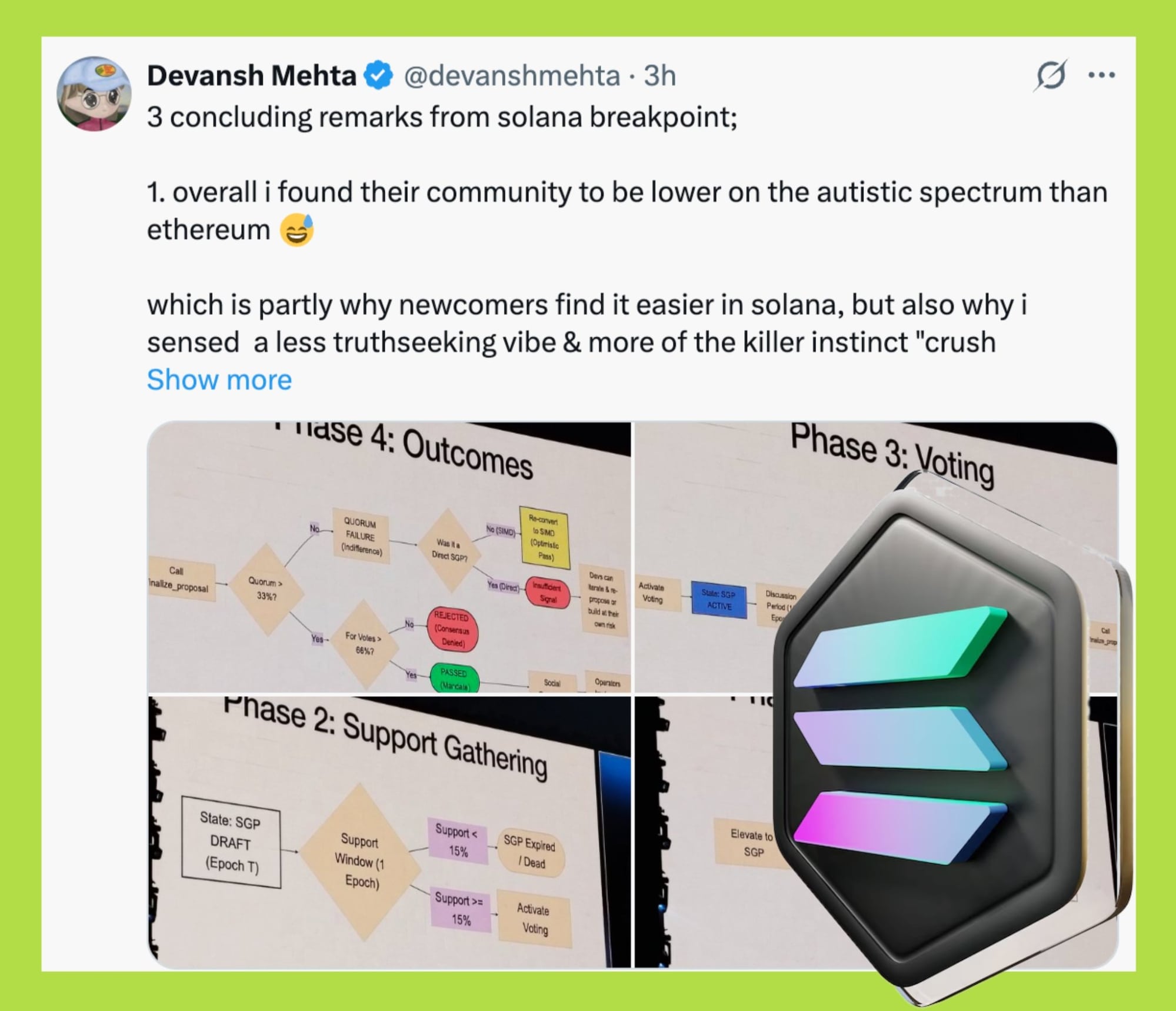Với nhà đầu tư dài hạn, những yếu tố về văn hóa này không tạo lợi nhuận ngay lập tức, nhưng ảnh hưởng trực tiếp đến khả năng giữ builder, tốc độ đưa sản phẩm ra thị trường và khả năng phản ứng khi điều kiện thay đổi. Breakpoint 2025 cho thấy Solana đang vận hành giống một tổ chức công nghệ bước vào giai đoạn mở rộng, không còn là một thử nghiệm thuần túy. Điều này không đảm bảo thành công, nhưng giúp giảm rủi ro thực thi – thứ thường chỉ lộ rõ khi đã quá muộn.