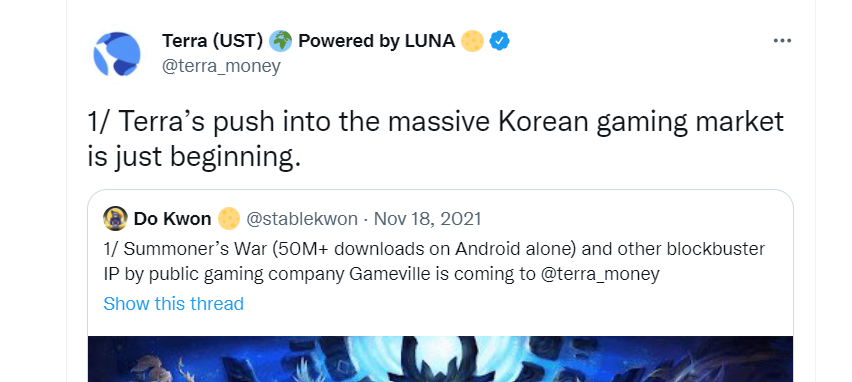 - NFT-based Games with DeFi model: In November 2021, Terra announced to roll in the gaming market in Korea, giving a good signal since Korea’s gaming industry was estimated to have a value of over $15B in 2020.