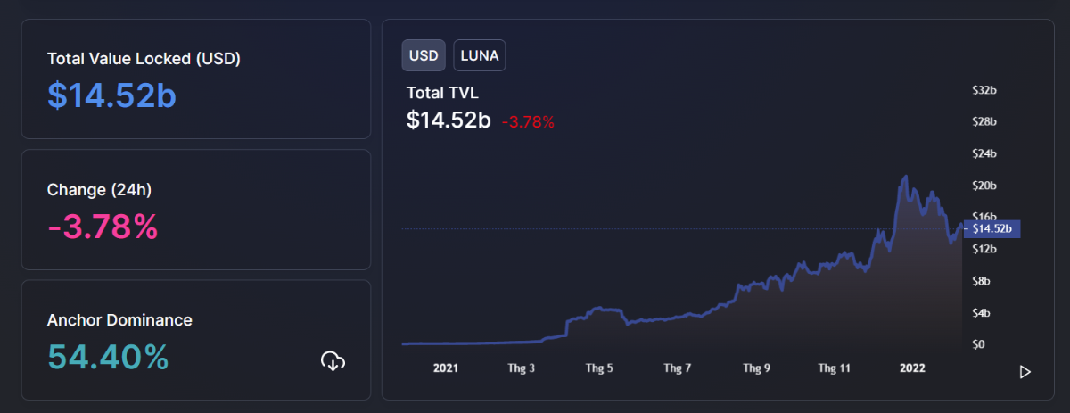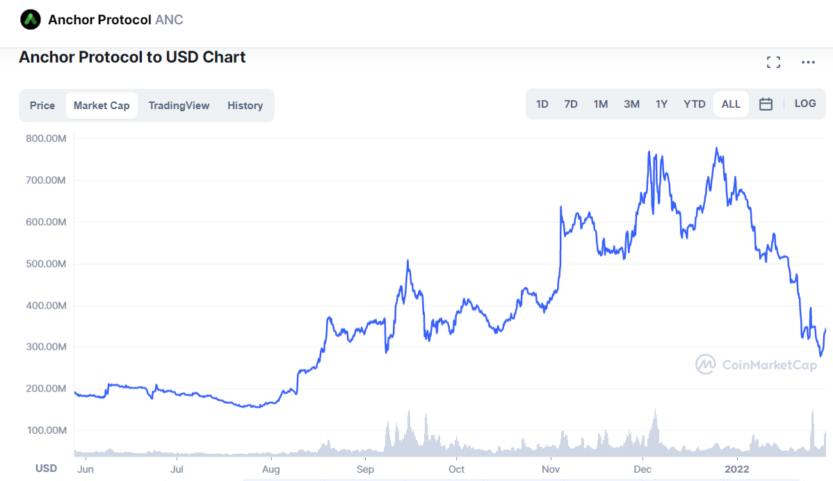 - Anchor Protocol, a decentralized money market incubated by Terraform Labs, with a TVL of $7.9B is dominating the Terra ecosystem. The graph shows the stable growth of the TVL on Anchor, meaning the money flow is pouring in the protocol. On the flip side, the ANC token market cap seems to go the other way at the beginning of 2022.
