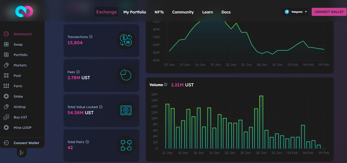 - Loop Markets is an exchange hub on top of Terra blockchain, containing many utilities for users to experience. The total TVL of Loop Markets is about $50M, a humble number in comparison to other DEXs. However, the platform has built a DeFi suite on Terra to facilitate users with crypto trading.