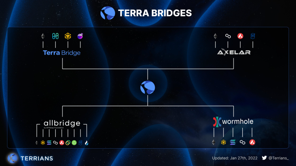 Cross-chain bridges allow Terra to expand beyond its ecosystem, especially it’s built on top of the layer-0 blockchain platform, Cosmos. Allbridge, Wormhole, Axelar, and Terra Bridge help crypto assets interconnect among blockchains.