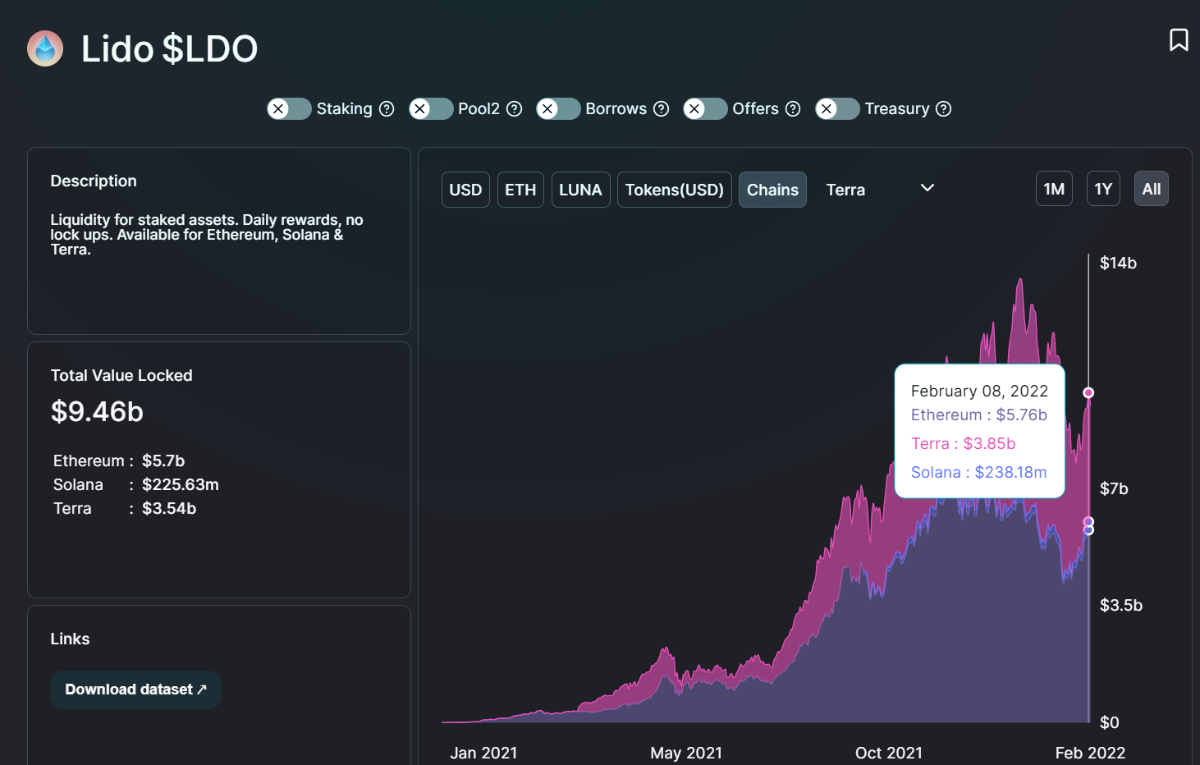 - LIDO, a liquidity staking platform, is the second biggest name on Terra with over $3.5B in TVL. The platform is also available on Ethereum and Solana with $5.7B and $200M in TVL, respectively.