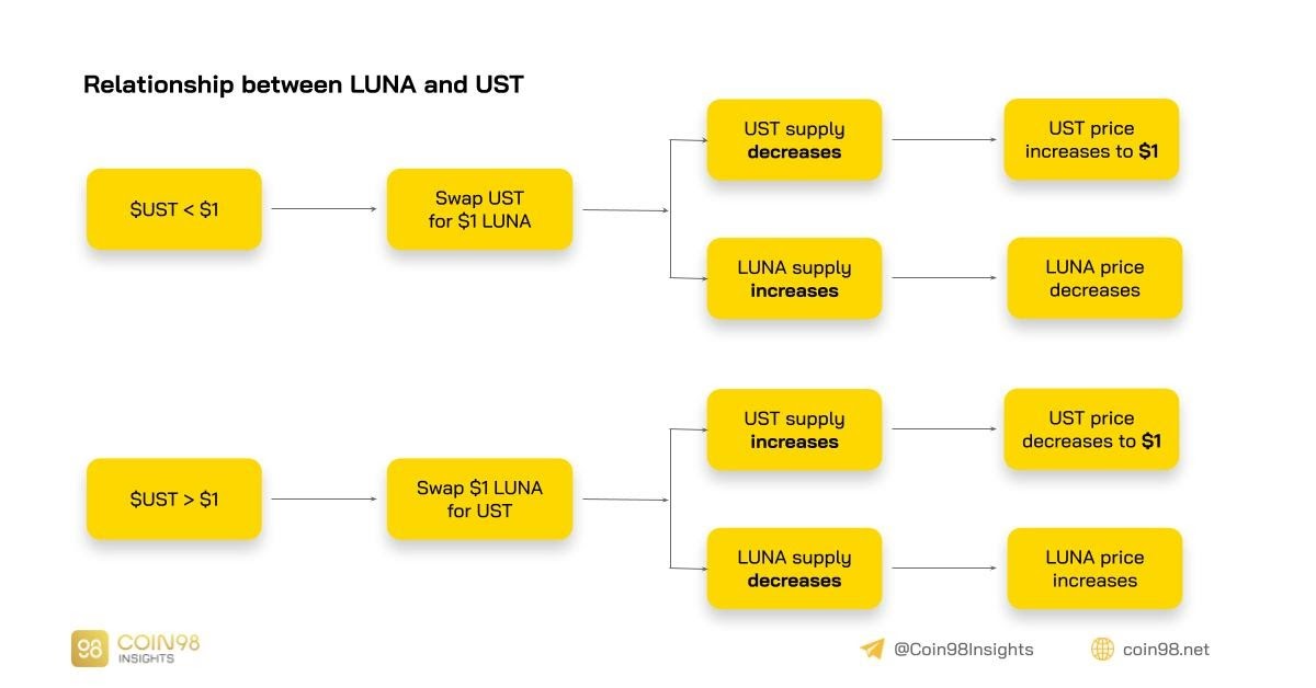 - Algorithmic stablecoin UST: LUNA has a knot-knit relationship with UST since the rebalance mechanism of the stablecoin relies on LUNA. In short, UST > $1, then $1 worth of LUNA is swapped to UST to increase the supply of UST to get the stablecoin back to $1 and vice versa. It’s for the first time when the future of a DeFi ecosystem is pegged to the UST stablecoin implemented at a large scale.