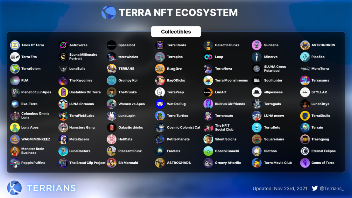 ⇒ Despite the DeFi-focused strategy, NFTs on Terra also thrive. We can name some NFTs that are similar (somewhat forked) to NFTs on other emerging blockchain platforms, Galactic Punks, LunaKiittys, Luna Apes, Wat Da Pug, TerraFloki Labs, etc.