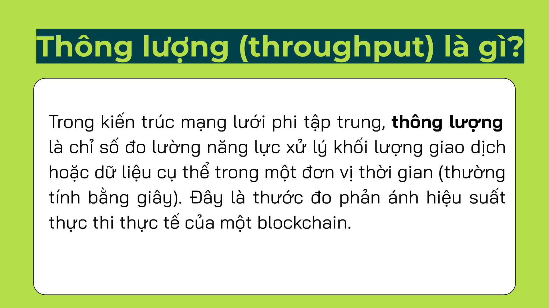 Trong kiến trúc mạng lưới phi tập trung, thông lượng là chỉ số đo lường năng lực xử lý khối lượng giao dịch hoặc dữ liệu cụ thể trong một đơn vị thời gian (thường tính bằng giây). Đây là thước đo phản ánh hiệu suất thực thi thực tế của một blockchain.