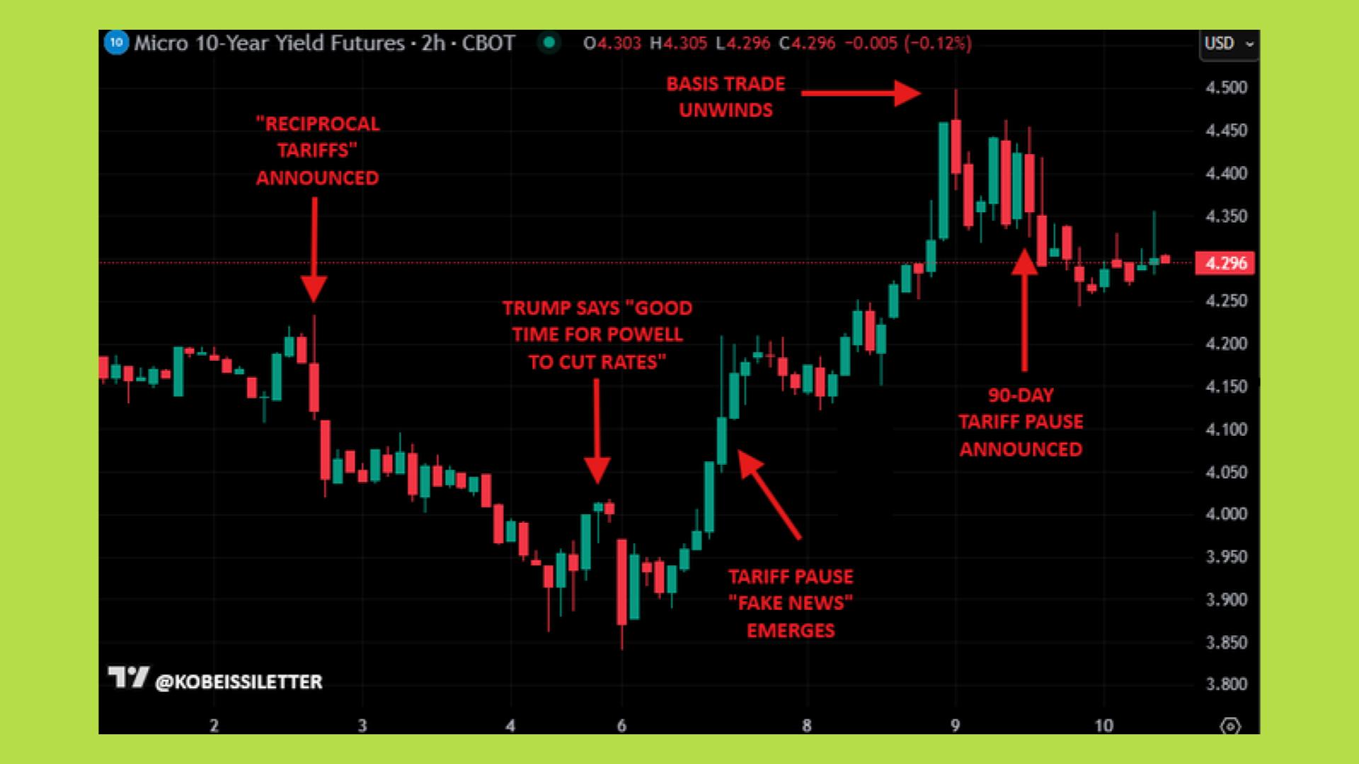 Ngay trước thời điểm công bố tạm ngừng thuế quan 90 ngày (9/4), lợi suất tiếp tục leo thang, và chỉ vài giờ sau đó, chính quyền Trump buộc phải tạm dừng thuế quan. Ngày 10/4, Donald Trump công khai thừa nhận rằng ông đang theo dõi sát thị trường trái phiếu.