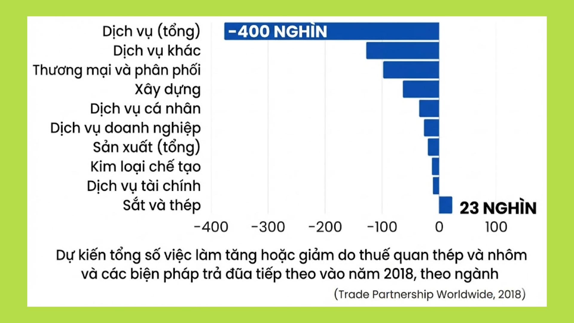 Quan trọng hơn, dữ liệu về việc làm cho thấy tác động tiêu cực lan rộng sang các ngành hạ nguồn: trong khi ngành sắt thép chỉ tạo thêm khoảng 23,000 việc làm, khu vực dịch vụ lại mất tới 400,000 việc làm, chủ yếu ở thương mại, phân phối và xây dựng. Điều này cho thấy lợi ích của thuế quan tập trung vào một nhóm ngành rất hẹp, trong khi chi phí được phân bổ trên toàn nền kinh tế.