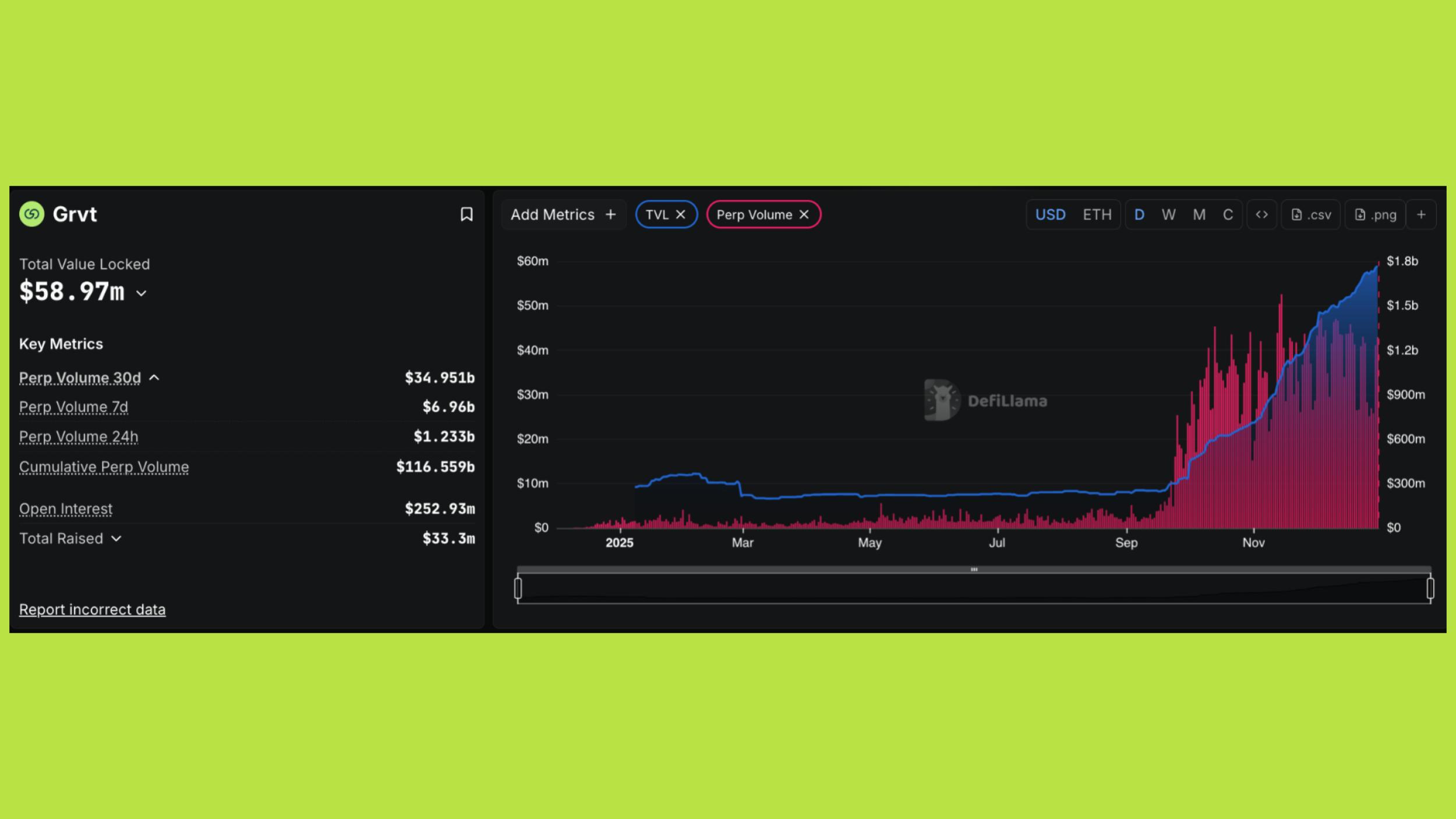 Open Interest của GRVT hiện vào khoảng 252.93 triệu USD, thể hiện tổng giá trị các vị thế đang mở trên nền tảng. Chỉ số này cho thấy mức độ tham gia thực của trader và thanh khoản tương đối tốt, đặc biệt trong bối cảnh GRVT vẫn đang ở giai đoạn tăng trưởng và mở rộng hệ sinh thái.
