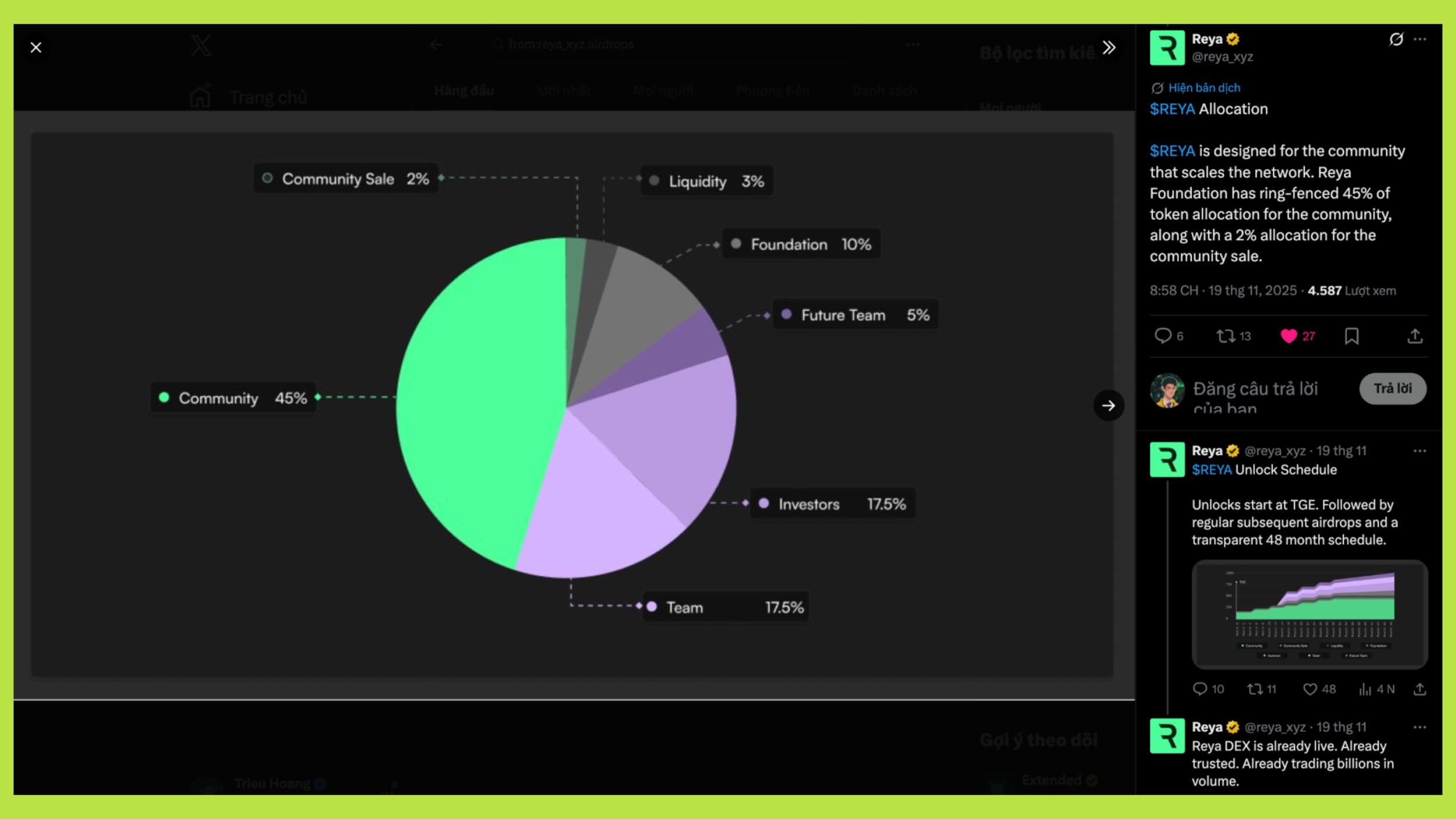 Về cơ hội airdrop, Reya đã xác nhận rằng phân phối token sẽ bắt đầu với một đợt airdrop cho người dùng Reya tại TGE, sau đó sẽ có nhiều vòng airdrop tiếp theo với thời gian và lượng token được quyết định bởi governance và Reya Foundation. Người dùng tích cực giao dịch, staking hoặc cung cấp thanh khoản trên Reya có khả năng được ưu tiên nhận token khi các đợt airdrop diễn ra. Điều này, kết hợp với phần cộng đồng chiếm 45% tổng cung, tạo cơ hội đáng kể cho những người tham gia từ giai đoạn đầu.