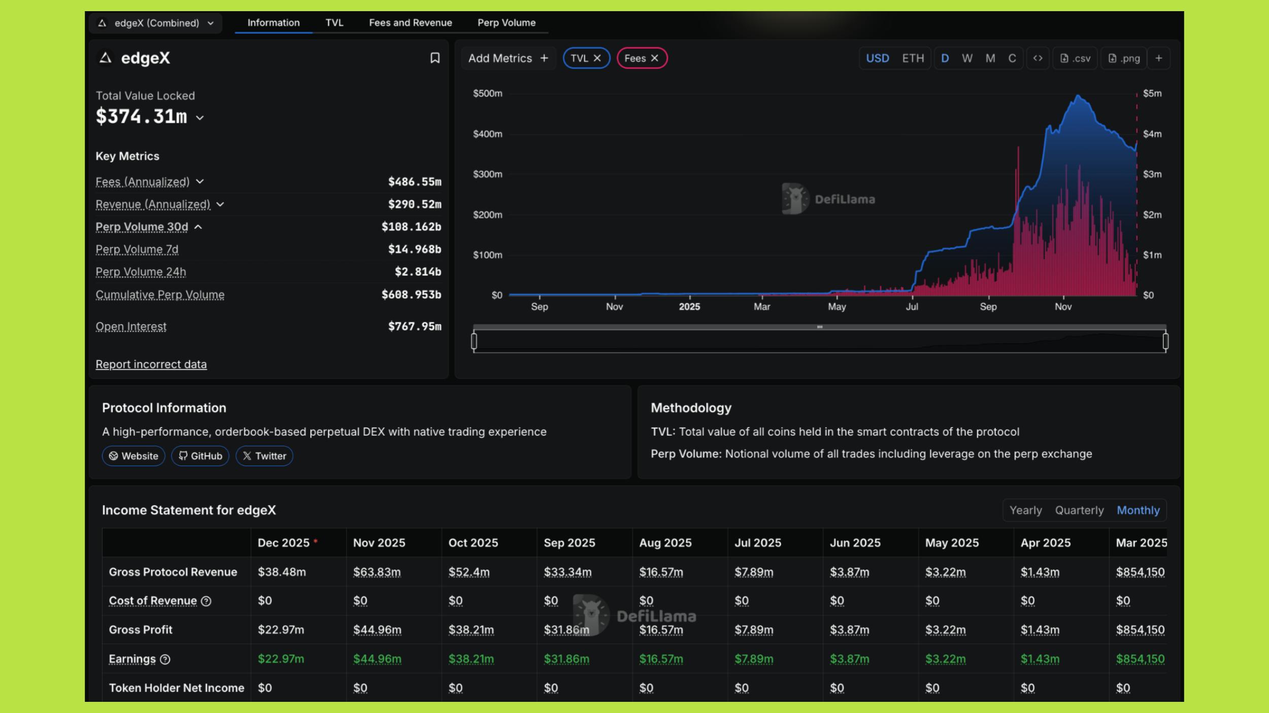 Về hiệu quả vận hành, edgeX đang ghi nhận phí giao dịch annualized khoảng 486.55 triệu USD và doanh thu annualized khoảng 290.52 triệu USD. Doanh thu theo tháng cho thấy xu hướng tăng trưởng rõ rệt, với khoảng 63.83 triệu USD trong tháng 11/2025, 52.4 triệu USD trong tháng 10/2025 và 33.34 triệu USD trong tháng 9/2025. Chi phí vận hành gần như bằng 0 cho thấy mô hình DEX perpetual có khả năng mở rộng tốt khi khối lượng giao dịch tăng.